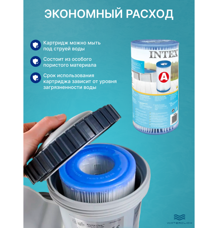 Картридж Intex 29000 тип A устанавливается в картриджные фильтр-насосы и выполняет функцию механической фильтрации воды. Конструкция изготовлена из плотного фильтрующего материала, который задерживает загрязнения, песок и мелкие частицы.
