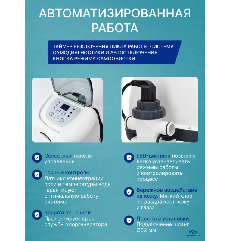 В воде растворяется дешевое и безопасное количество соли, и система сама обеспечивает чистоту на весь сезон без запаха и раздражения кожи. Простая установка (вся комплектация в коробке), автоматический таймер работы, интуитивное обслуживание.