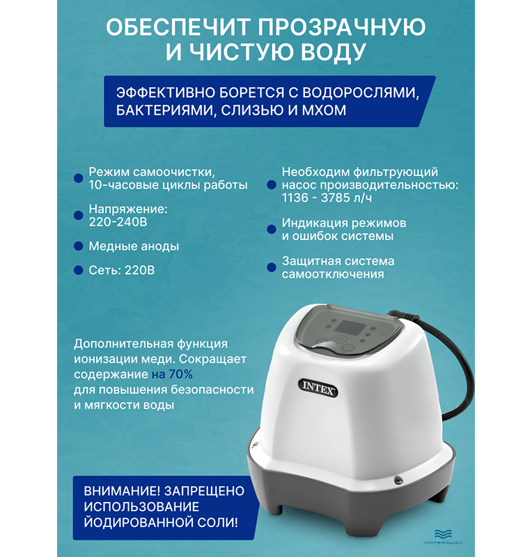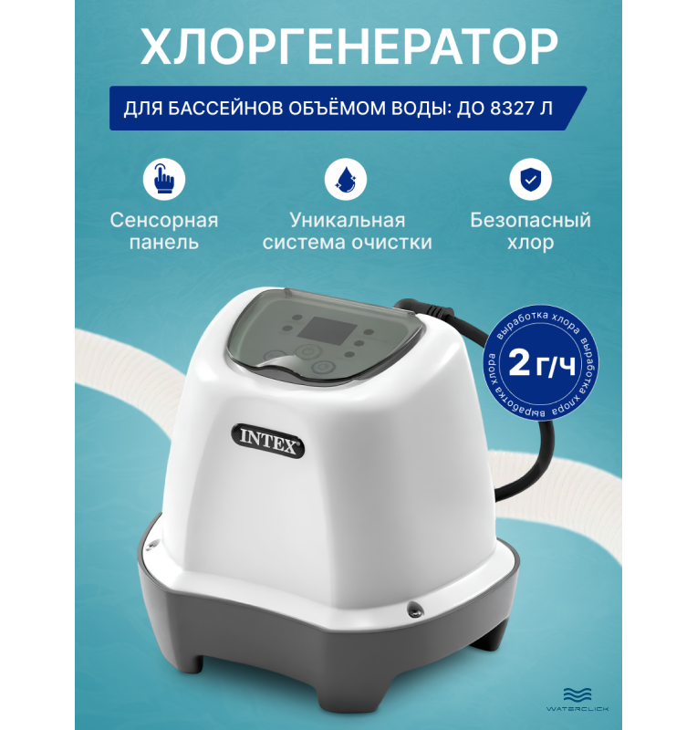 Хлоргенератор Intex 26662 — современное решение для дезинфекции воды без химических таблеток! Аппарат подойдёт для бассейнов объёмом до 8,3 м³, производит до 2 г/ч активного хлора методом электролиза морской соли.