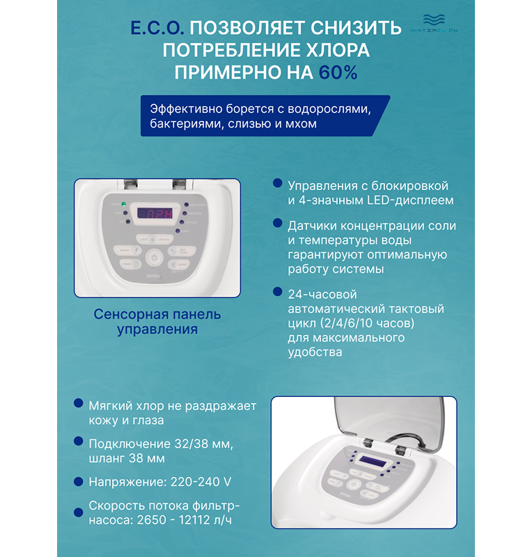 Подойдёт для каркасных и надувных бассейнов (Intex, Bestway и др.). Есть панель управления, индикатор уровня соли, простая инструкция на русском. Отзывы пользователей подчёркивают — после монтажа вода всегда чистая, не пахнет и не вызывает раздражения на коже.
