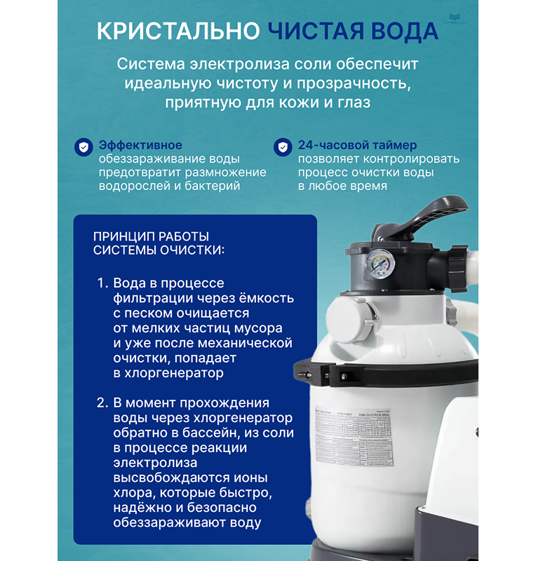 | Тип системы | песочный фильтр-насос + электролитический хлоргенератор |