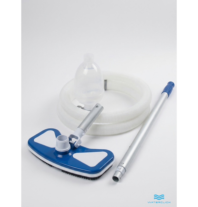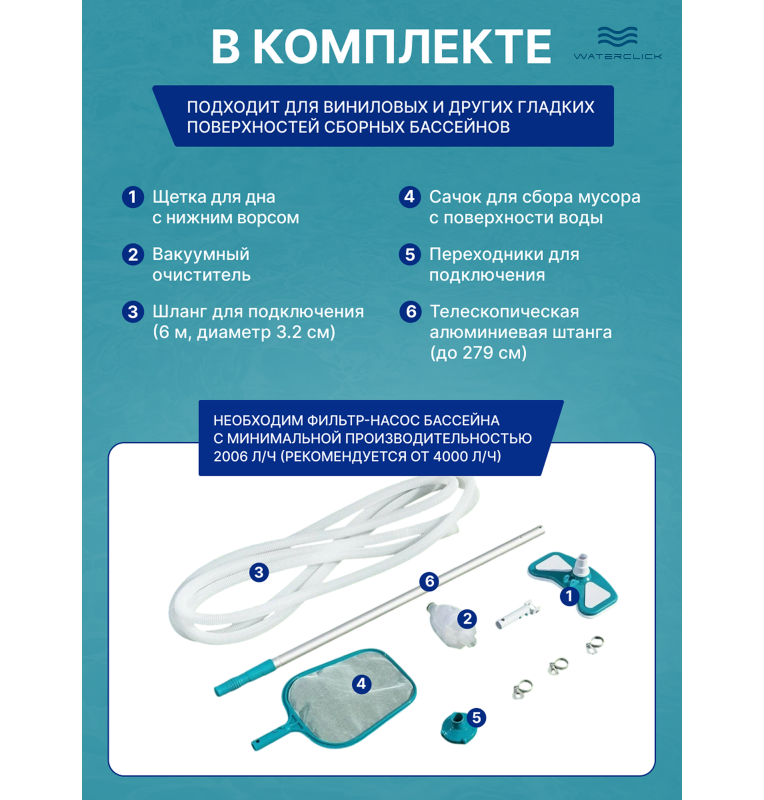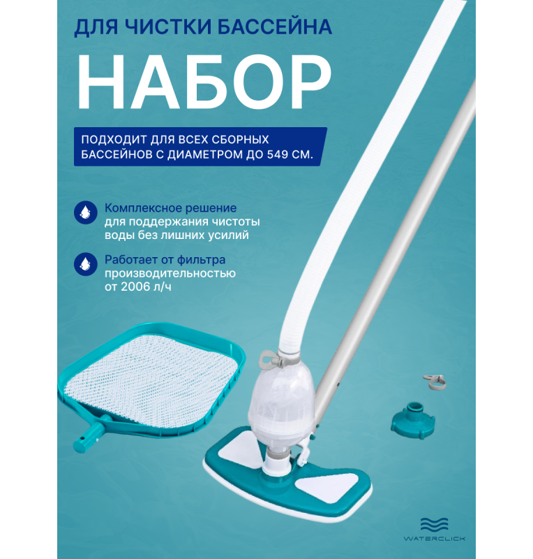 • Всё для уборки: пылесос, сачок и штанга — полный арсенал для чистоты бассейна.