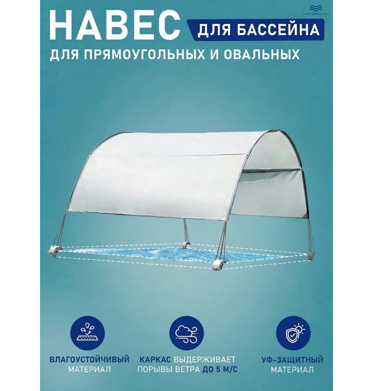 Главная задача этого навеса — обеспечить вашему бассейну надежную защиту от палящего солнца в жаркий полдень и от резких дождей или пролётного мусора в период непогоды. Благодаря плотному водоотталкивающему материалу с УФ-защитой навес создаёт приятную полутень, существенно снижает температуру воды от перегрева, а также защищает неабразивные поверхности и аксессуары бассейна от выгорания. Специальная арочная конструкция не мешает свободному входу и выходу, не закрывает обзор, а проветриваемые боковые панели позволяют спокойно отдыхать даже в душный день.
