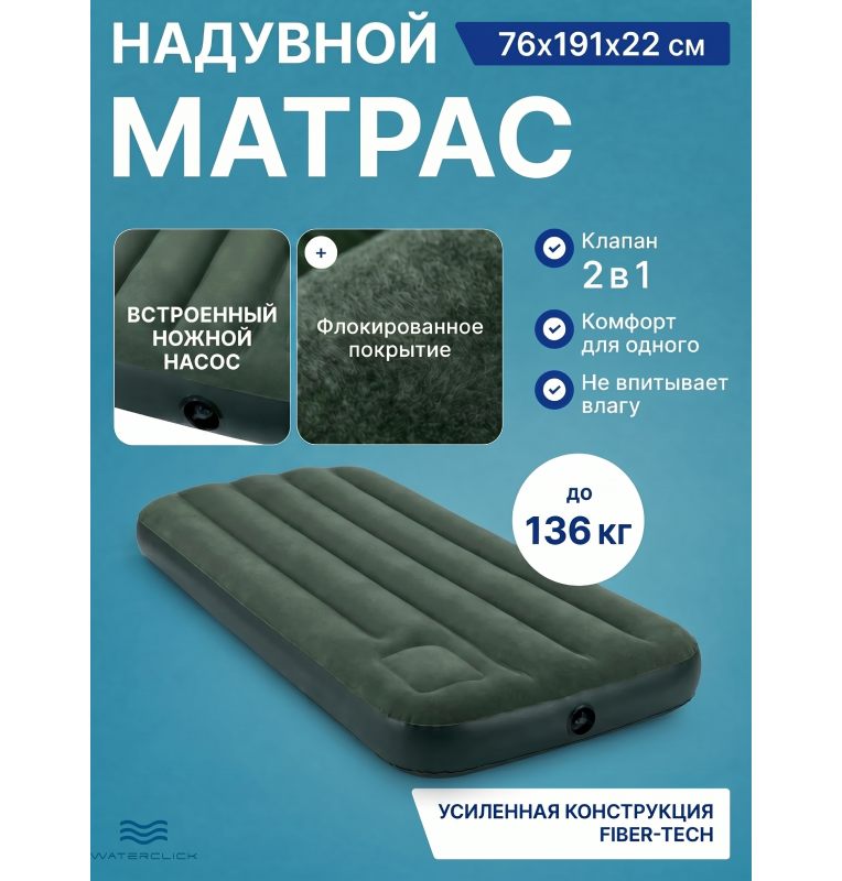 Надувной матрас + встроенный ножной насос "Downy Airbed With Fiber-Tech", 76х191х22, до 136 кг, Intex 66950