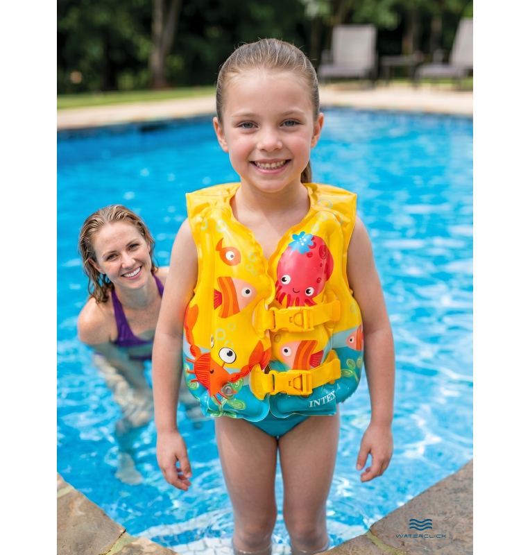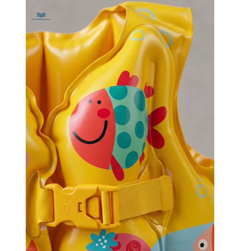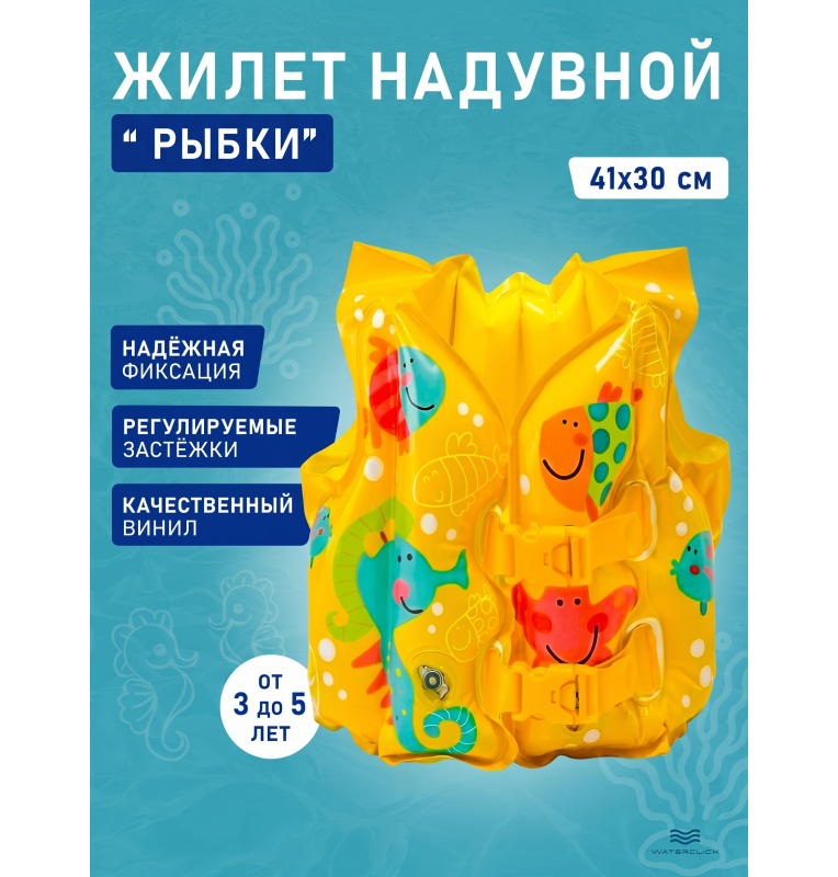 • Яркий дизайн: привлекательный жёлтый цвет с изображением морских обитателей делает ребёнка более заметным на воде.