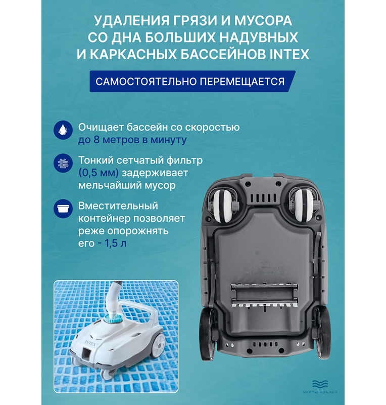 Компактный корпус, низкий уровень шума, простая установка — пылесос предназначен для бассейнов любых форм (Intex, Bestway и совместимых). Система автоматически перемещается по дну, адаптируясь к погружению и небольшим неровностям покрытия. Комплект содержит всё необходимое для быстрого монтажа и запуска без специальных навыков.