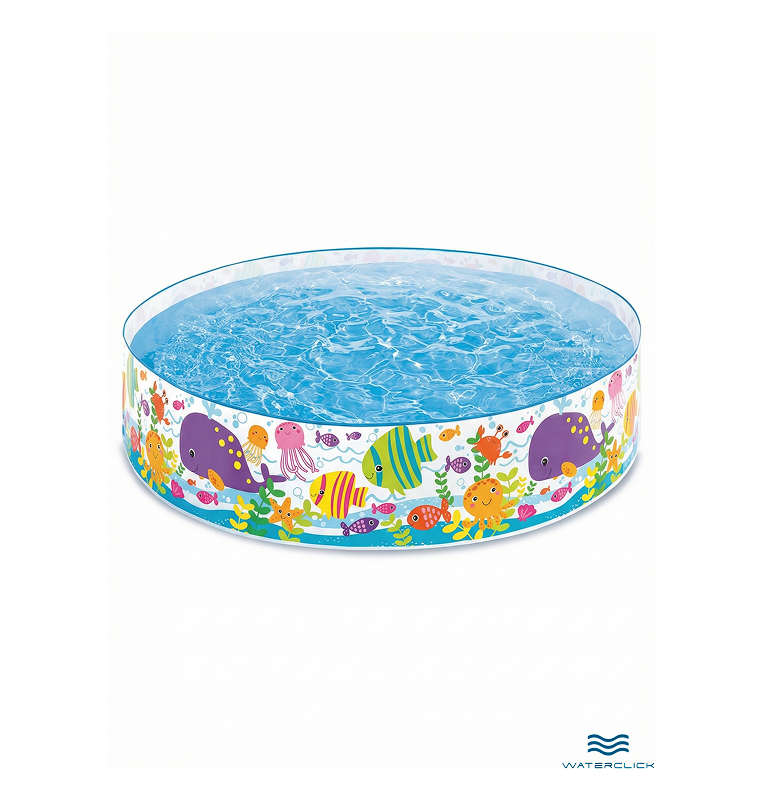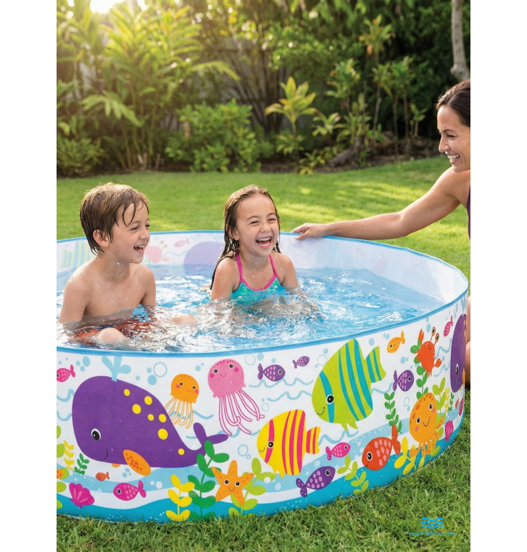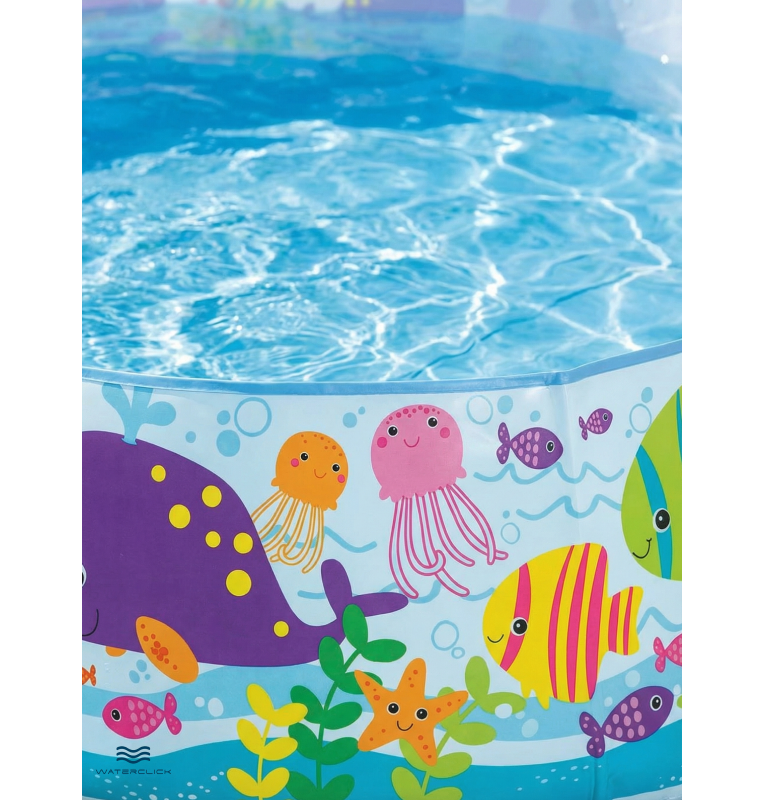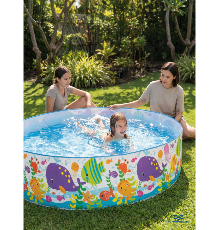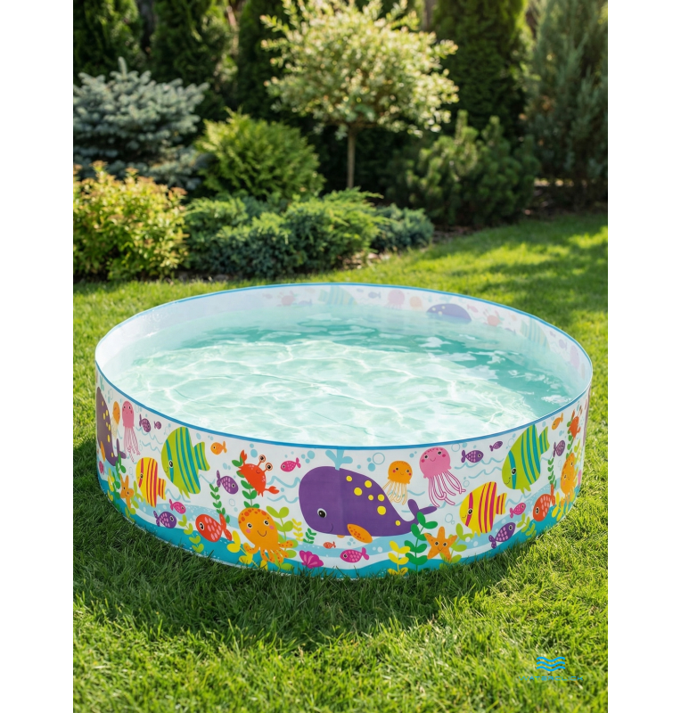 Бассейн выполнен из прочного и эластичного ПВХ, устойчивого к ультрафиолету и неоднократным циклам заполнения и слива воды. Жесткие стенки обеспечивают форму, устойчивость и безопасную глубину для малышей, а красочный морской дизайн делает процесс купания ещё увлекательнее. Модель легко устанавливается без надувания: нужно лишь выбрать ровную площадку, развернуть каркас и наполнить его чистой водой. После использования бассейн быстро сливается и занимает минимум места при хранении.