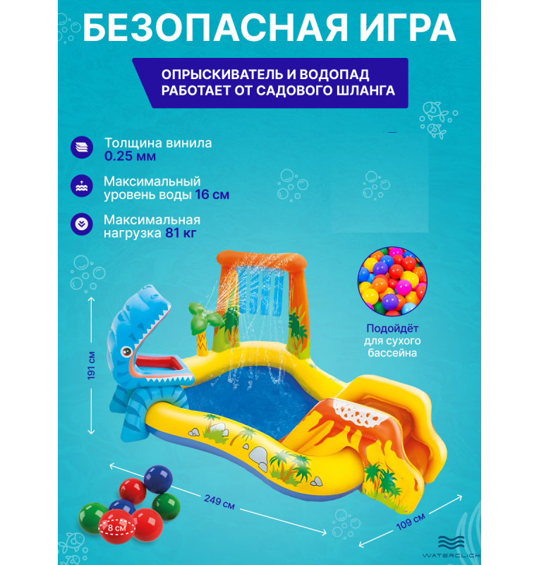 - Максимум развлечений: в комплекте – водопад, надувная горка с мягкой посадкой, кольца и фигурки динозавров для метания шариков. Можно устраивать дома настоящий праздник!
