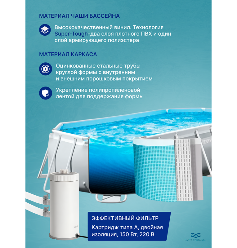 - Современная комплектация: фильтр-насос, лестница, подстилка, тент