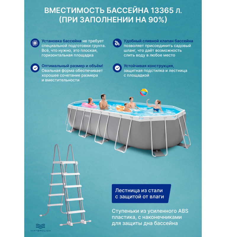 - Оптимальный объём (13 365 л): бассейн подходит для семейного использования
