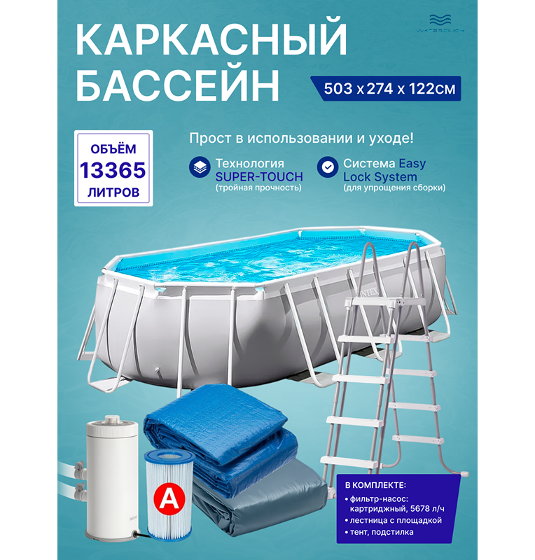 Бассейн каркасный овальный Intex 26796, 503х274х122см, 13365л, картриджный фильтр-насос, лестница, тент, подстилка