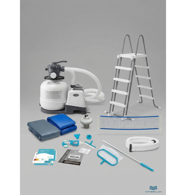 Песочный насос-фильтр с хлорогенератором, лестница, тент, подстилка под бассейн, скиммер, набор для чистки, волейбольная сетка, руководство по эксплуатации