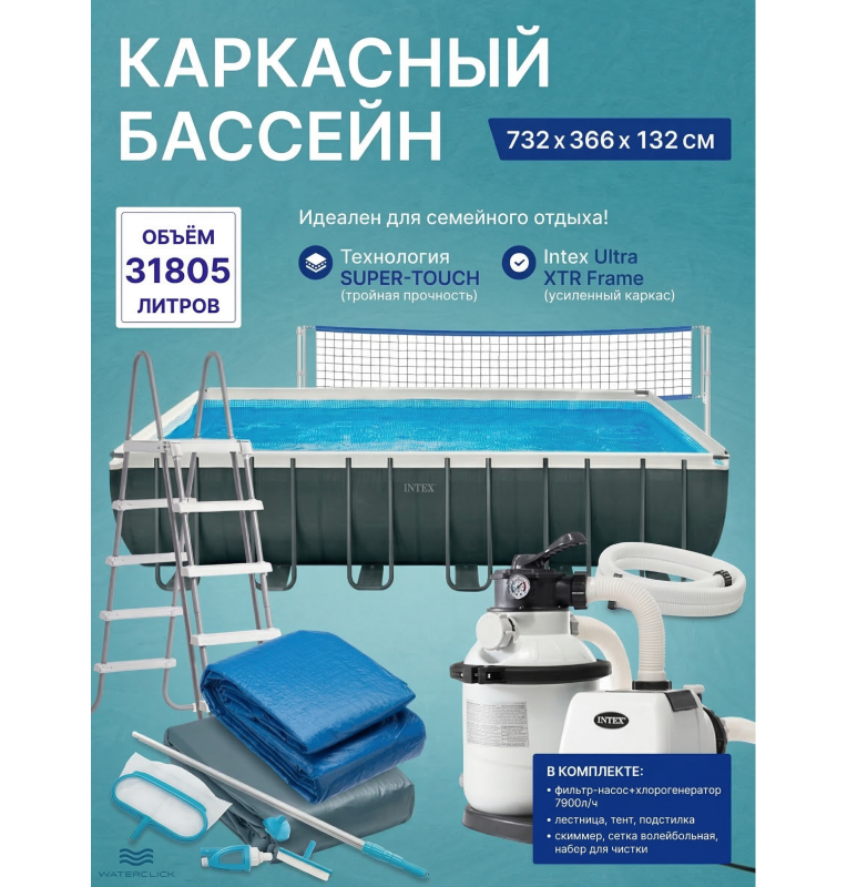 Каркасный прямоугольный бассейн (усиленная чаша) intex 26368 "Ultra Frame", 732х366х132см см, 31805л, фильтр-насос с хлорогенератором, лестница, тент, подстилка, скимер, сетка волейбольная