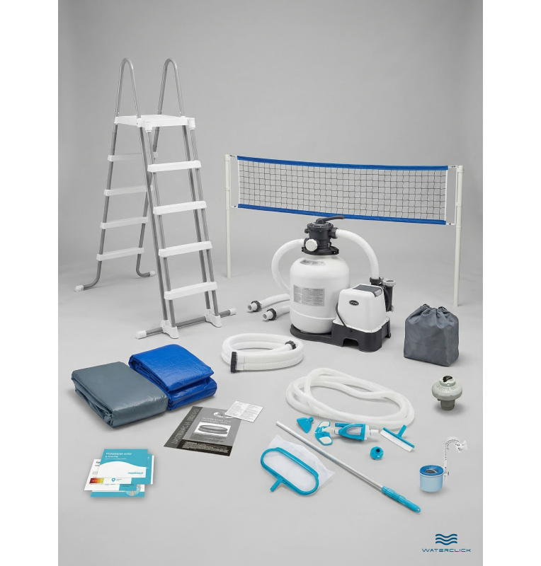 В комплектацию бассейна входит фильтр-насос с хлорогенератором для автоматической очистки воды без лишней химии, удобная лестница, защитный тент, подстилка для дна, комплект для чистки со скиммером и стильная волейбольная сетка для активных игр. Установка и запуск бассейна занимает 2–3 часа и абсолютно не требует специальных навыков. Каркасный бассейн Intex 26378 — отличное решение для тех, кто ценит комфорт, чистоту, спорт и семейное общение.