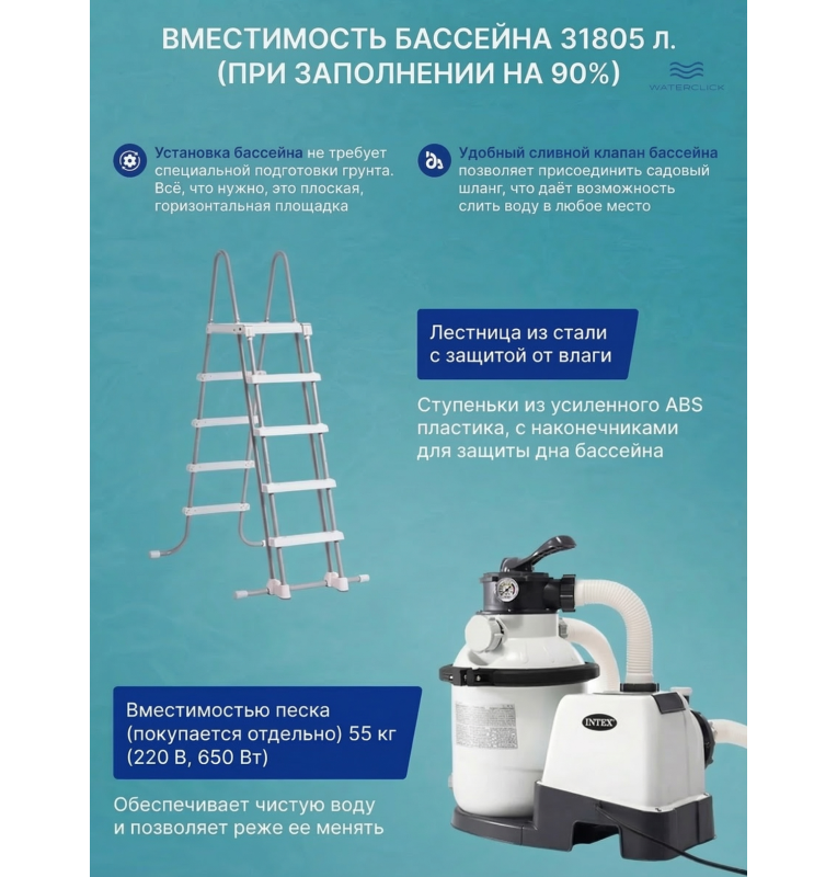 - Безопасная лестница, тент для защиты от мусора и подстилка для дна в комплекте
