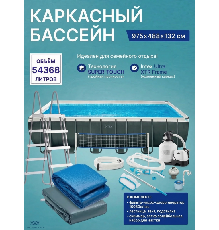 Каркасный прямоугольный бассейн intex 26378 "Ultra Frame", 975х488х132см, 54368л; фильтр - насос+хлорогенератор, лестница, тент, подстилка,комплект для чистки со скиммером,волейбольная сетка