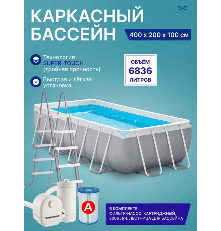Бассейн каркасный прямоугольный Intex 26788 "Prism Frame Rectangular" , 400х200х100см, 6836 л, фильтр-насос, лестница