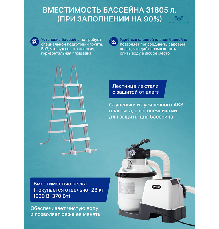 - Фирменный комплект: песочный фильтр-насос, лестница, тент, подстилка, инструкция.