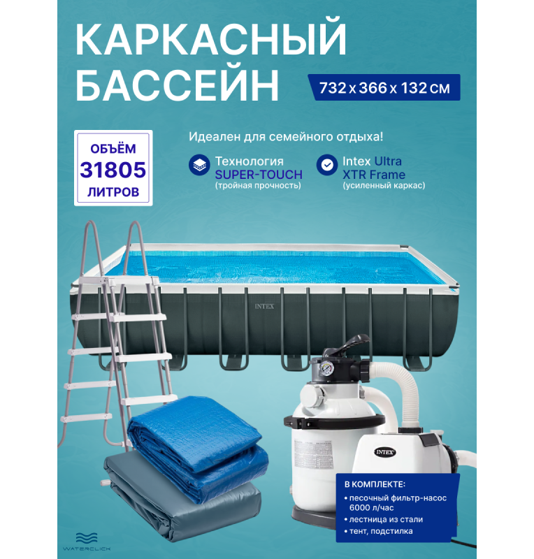 Каркасный прямоугольный бассейн intex 26364 "Ultra XTR Frame", 732x366x132см, 31805л; фильтр - насос, лестница, тент, подстилка