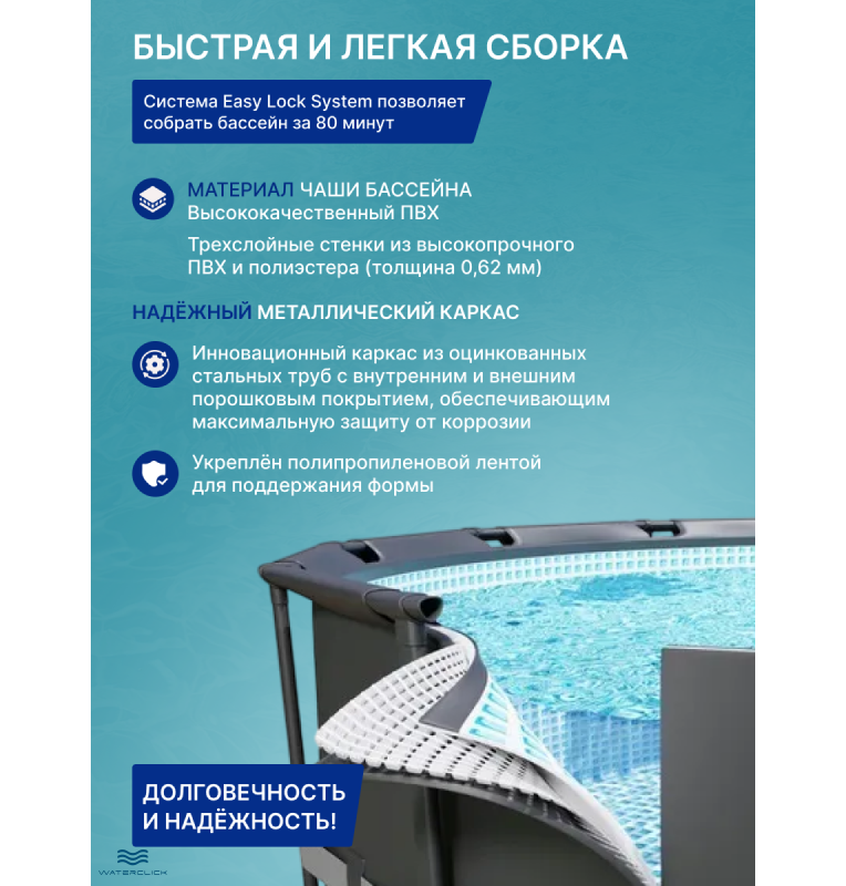 - Безопасность и комфорт: глубокий бассейн, удобная лестница, круглый формат — шанс купаться всей семьёй.