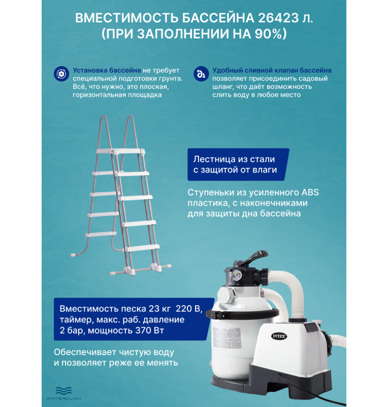 В комплект входит: бассейн, мощный песчаный фильтр-насос (отличная фильтрация), надёжная лестница с нескользящими ступенями, фирменный тент для защиты воды и прочная подстилка под бассейн.