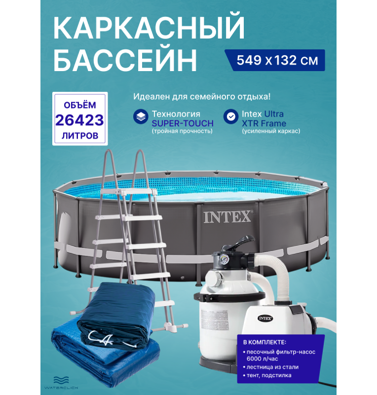 Каркасный бассейн круглый intex 26330NP "Ultra XTR Frame", 549*132 см, песчаный фильтр-насос, лестница, тент, подстилка