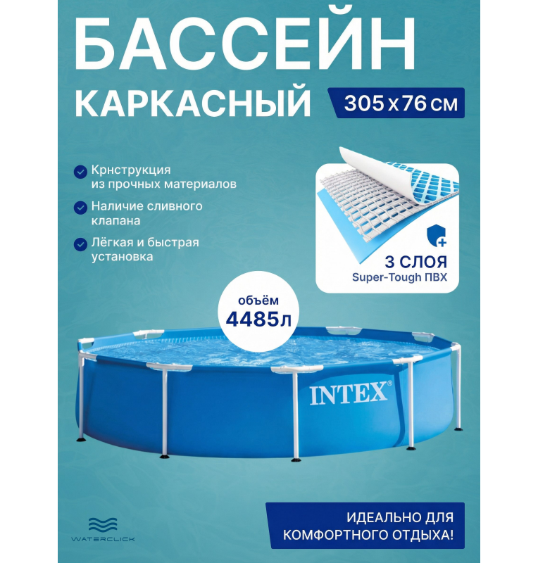 Каркасный бассейн Intex 28200 имеет размер 305x76 см и объем 4485 л. За счет высоты 76 см модель подходит для полноценного купания и комфортного отдыха всей семьи.