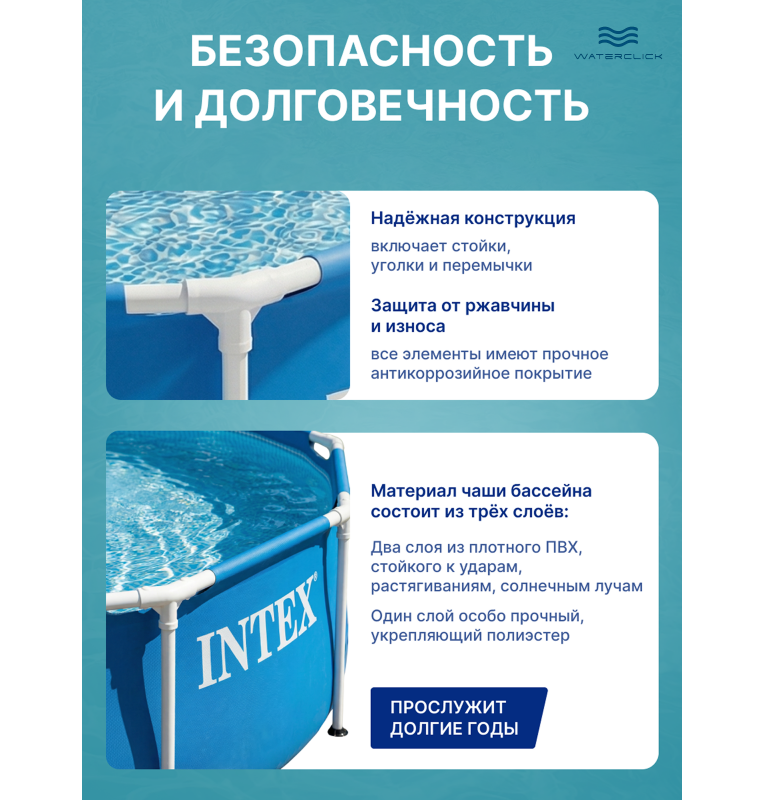 Intex 28200 Metal Frame рассчитан на сезонное использование на участке. Металлическая рама повышает жесткость конструкции по сравнению с надувными моделями, что делает бассейн более устойчивым при заполнении водой.