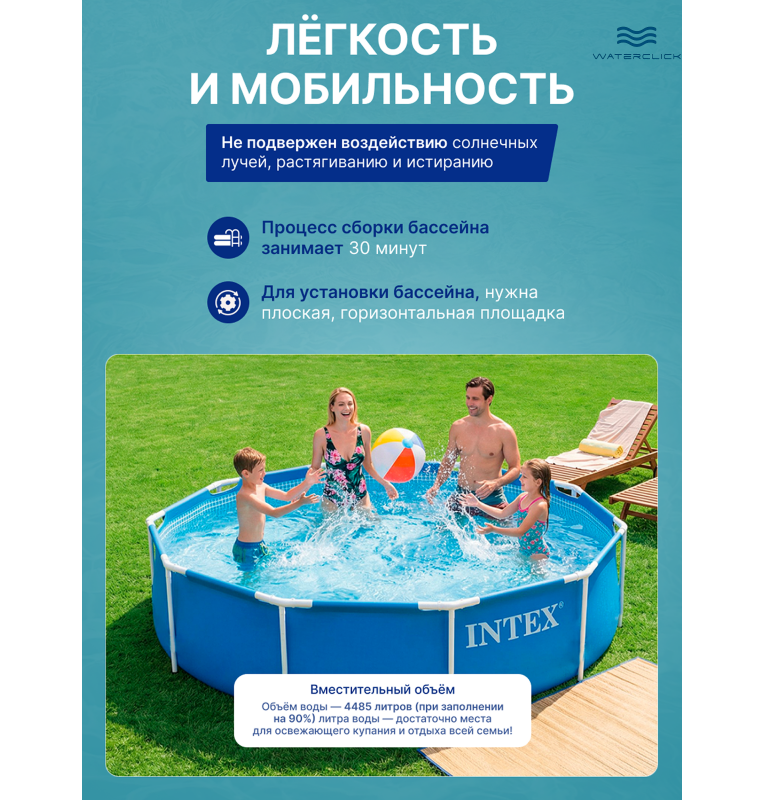 • Объем 4485 л — больше воды, чем у надувных аналогов