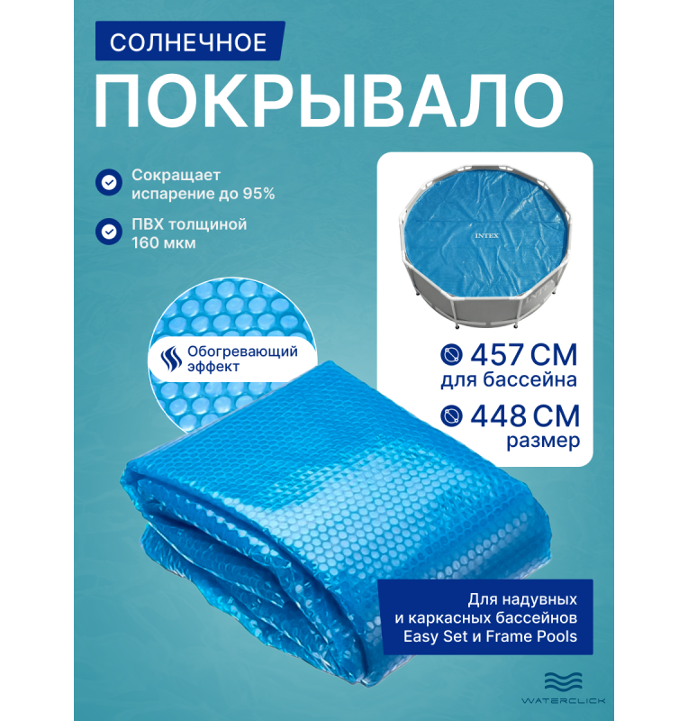 покрывало intex 28013 диаметром 448 см предназначено для круглых бассейнов 457 см. Модель относится к типу Solar Cover и создаёт эффект естественного нагрева воды за счёт солнечной энергии.