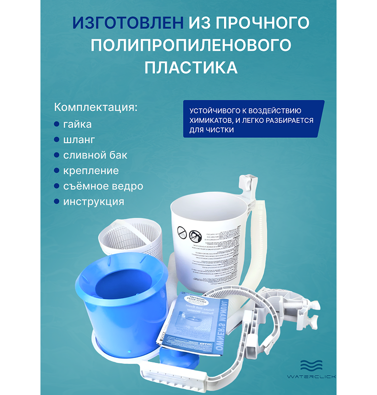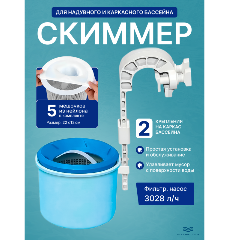 | Комплектация | скиммер, крепление, 5 съёмных мешок-фильтров, инструкция |