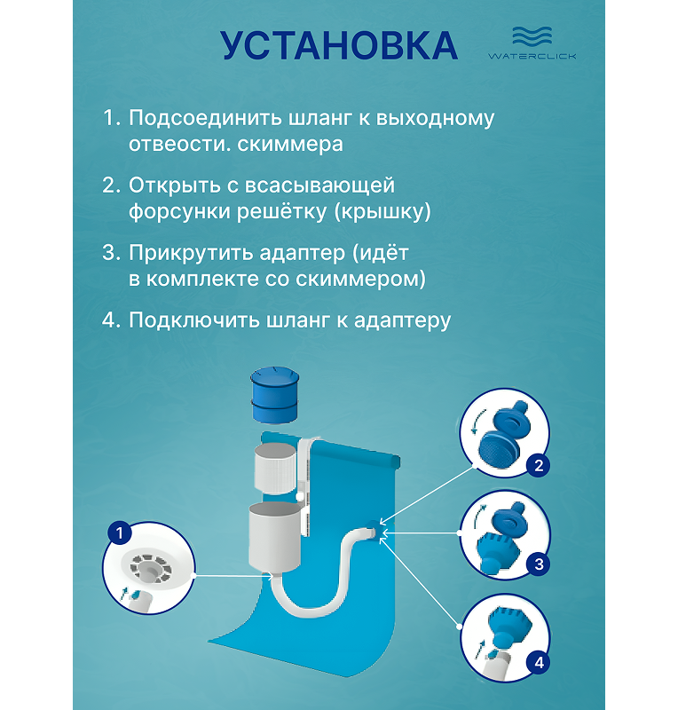 - Проверьте комплектацию при получении и установите скиммер на бассейн.