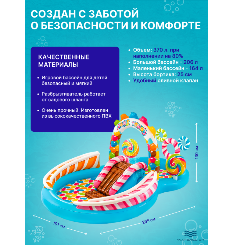 Игровой надувной центр Intex "Территория сладостей" (артикул 57149) — это красочный бассейн-аттракцион для малышей от 2 лет. Продуманный дизайн: горка с мягким спуском, фонтаны, надувные сладости, яркая тематика и вместительный бассейн объёмом 370 литров. Всё для весёлого и познавательного летнего отдыха на даче и природе! Бассейн легко надувается стандартным насосом, быстро наполняется водой, устойчив и безопасен за счёт мягких бортиков и продуманной глубины.