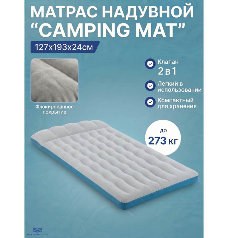 Двухместный надувной матрас Intex 67999 Camping Mat (размер 127×193×24 см) — универсальное решение для веселых поездок, кемпинга, дачного отдыха, путешествий и размещения гостей дома. Увеличенная ширина и прочная конструкция выдерживают до 273 кг, а высота матраса (24 см) обеспечивает комфортный сон на любой поверхности, даже на жёсткой земле или на полу.