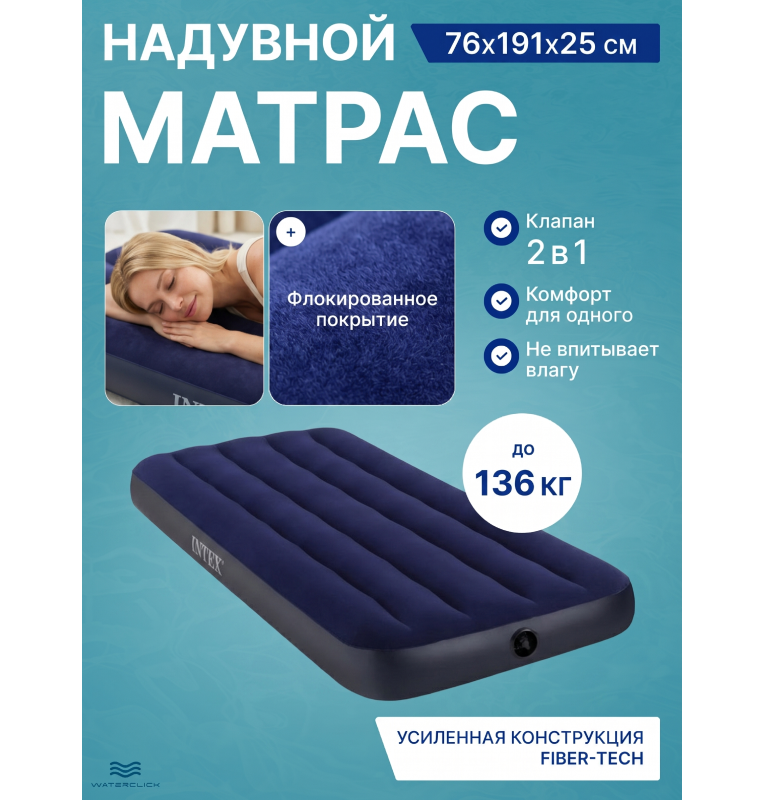 Надувной матрас "Classic Downy Air Mattress", 76х191x25см, до 136 кг, Intex 64756