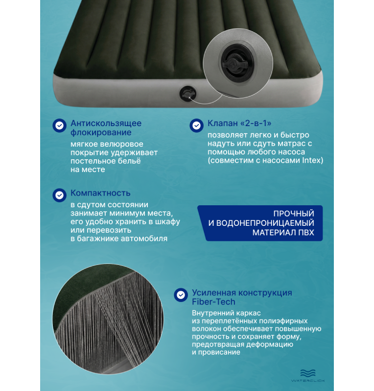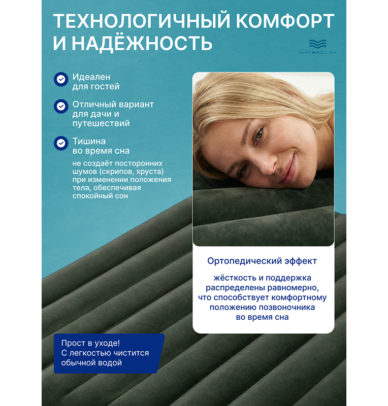Матрас покрыт приятным на ощупь велюровым слоем, который мягко поддерживает тело и не даёт соскальзывать простыням. Технология двойного клапана позволяет быстро надувать и сдувать матрас обычным или электрическим насосом, а специальная внутренняя конструкция поддерживает правильную форму без «гамака» даже при длительном использовании. Его удобно использовать как для гостей, так и для кемпинга, отдыха на природе или ночёвки в поездках.