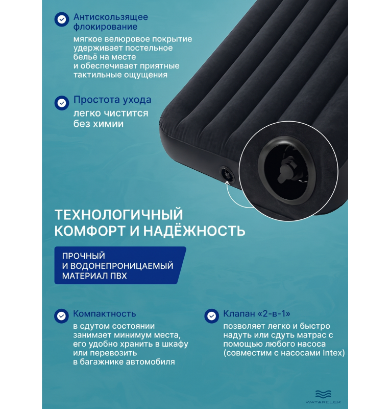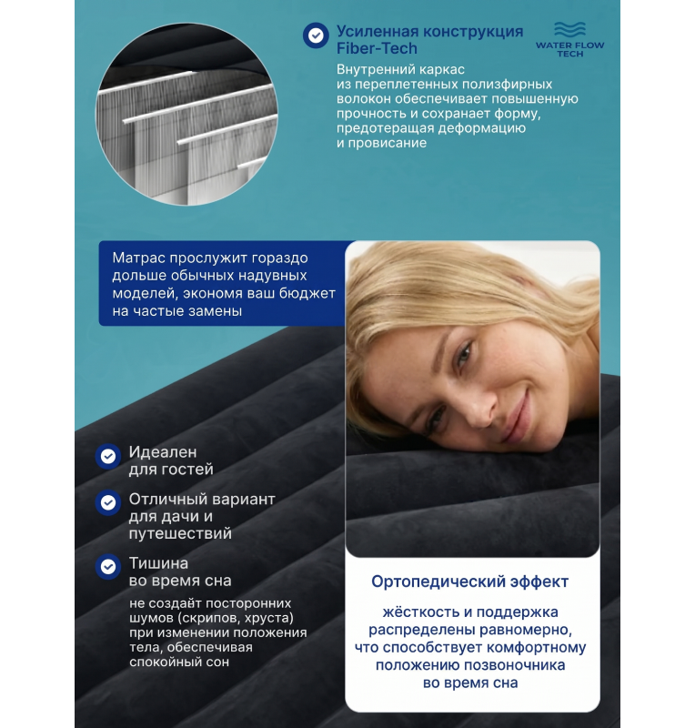 Верх матраса выполнен из приятного флокированного слоя (под велюр), не скользит и легко чистится. Допустимая нагрузка — до 273 кг! Армированные внутренние перегородки увеличивают срок службы, матрас выдерживает даже продолжительное использование. Надувается и сдувается за считанные минуты.