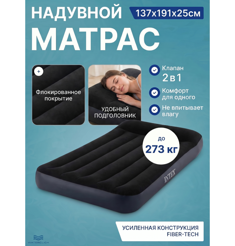 Надувной матрас с подголовником полутороспальный, 137x191x25см, до 273кг, Intex 64142
