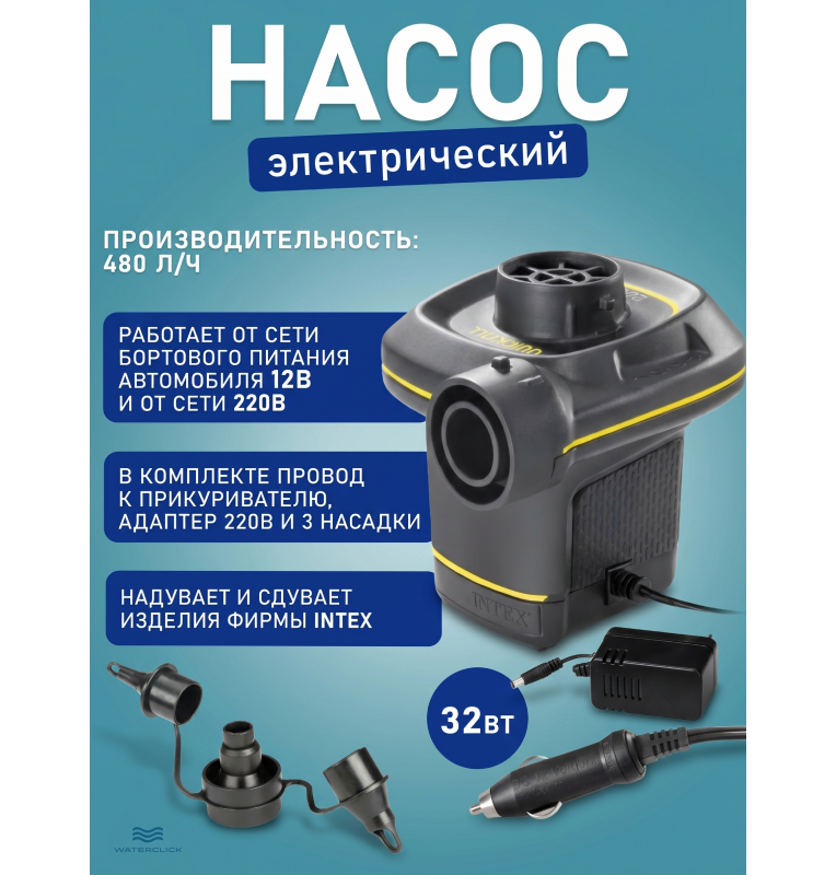 Насос электрический воздушный автомобильный/от сети, 12В/220В, 480л/мин, 3 насадки, Intex 66634