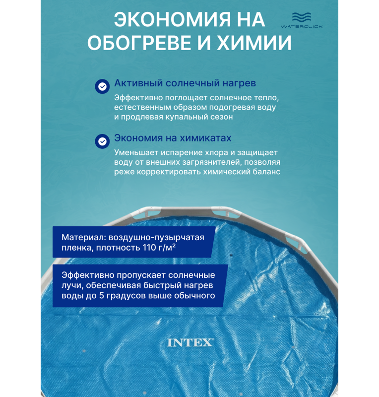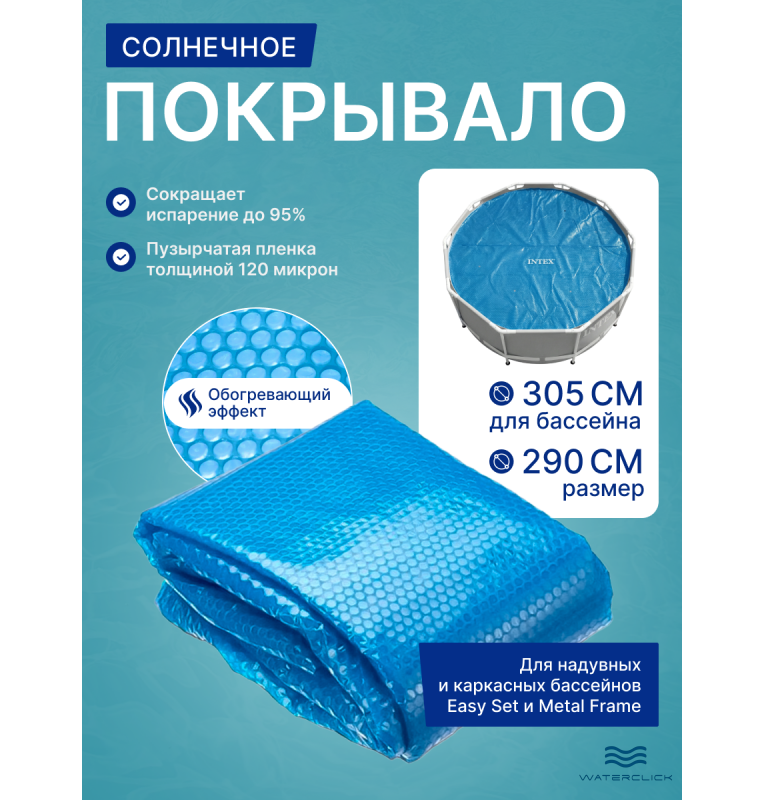 покрывало intex 28011 диаметром 290 см предназначено для круглых бассейнов 305 см. Модель относится к типу Solar Cover и создаёт эффект естественного нагрева воды за счёт солнечной энергии.