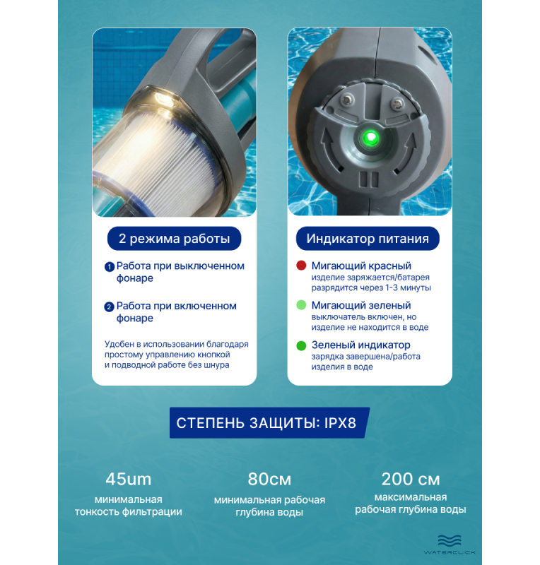 До 50 минут непрерывной чистки — достаточно для бассейна среднего размера.