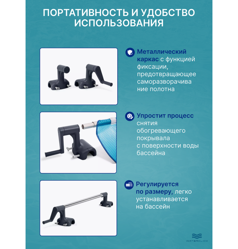 - Перед купанием — намотайте покрывало на барабан, вращая рукоятку.