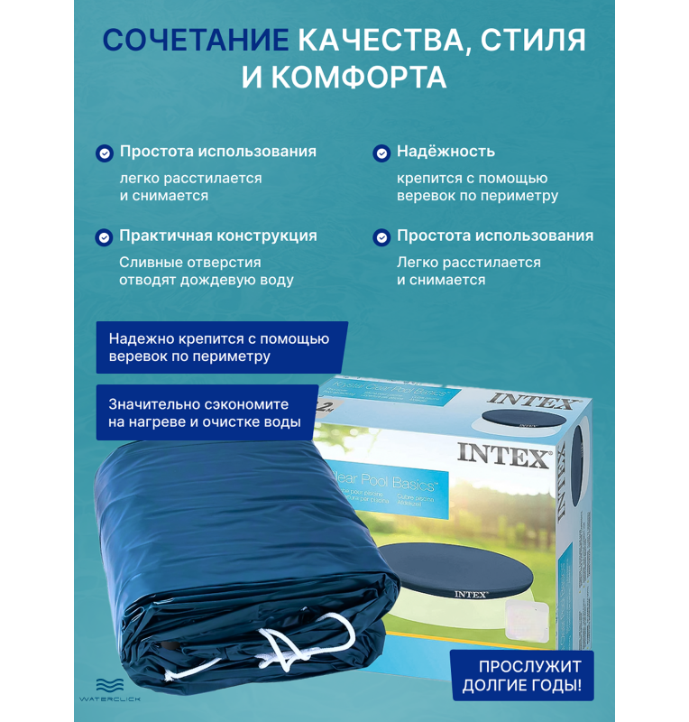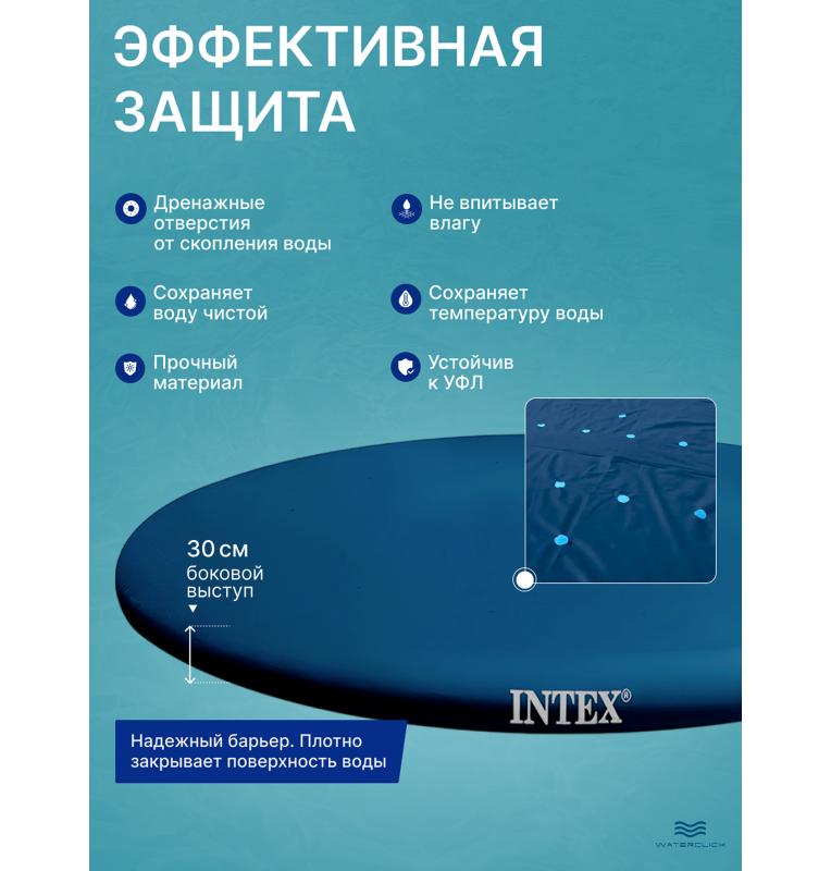 Intex 28021 — тент-накидка для сезонного использования на открытом участке. Покрывало закрывает поверхность воды и уменьшает попадание мусора и осадков в период простоя бассейна.