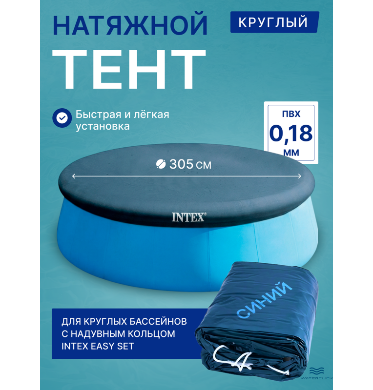 тент intex 28021 предназначен для круглых надувных бассейнов диаметром 305 см. Модель устанавливается поверх чаши и фиксируется по периметру, защищая воду от внешних загрязнений.