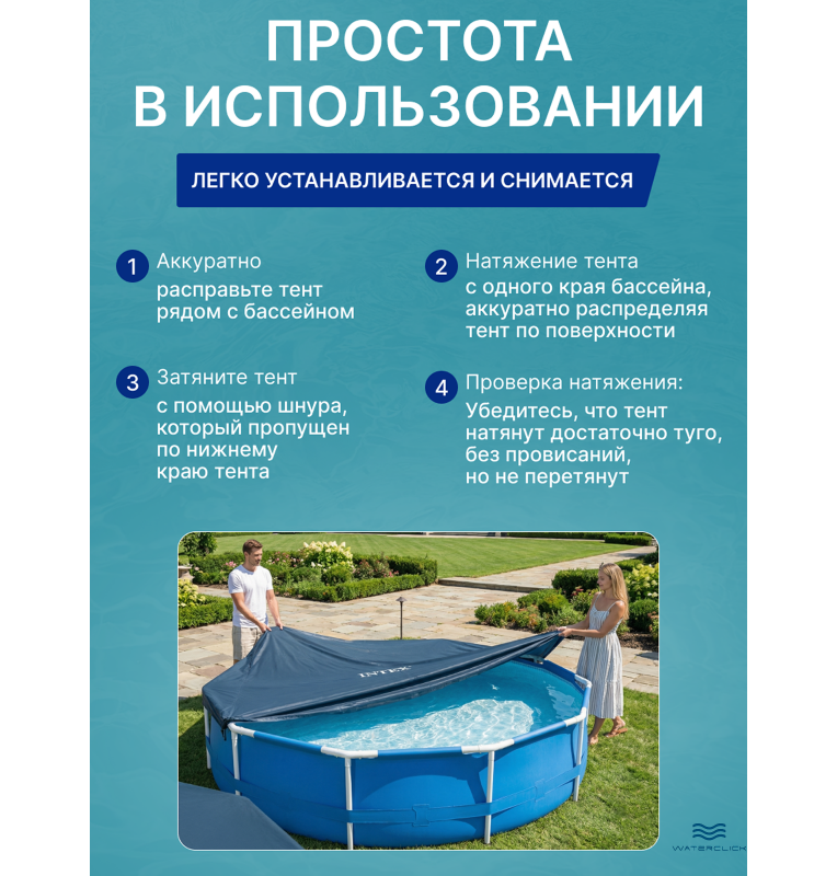 Модель Intex 28032 разработана для сезонной эксплуатации на открытом участке. Тент устанавливается поверх бассейна после купания или в ночное время и помогает поддерживать чистоту воды.