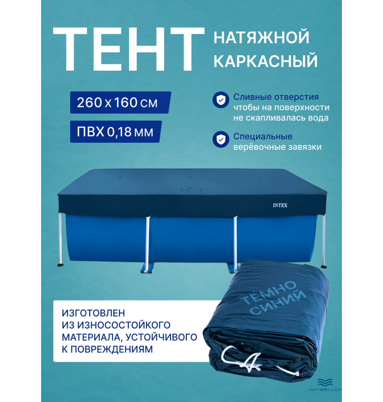тент intex 28036 рассчитан на прямоугольные каркасные бассейны размером 260×160 см. Он накрывает чашу сверху и фиксируется по периметру, снижая количество загрязнений, попадающих в воду.