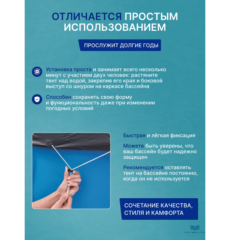 - Быстрая установка — накрыть бассейн можно за несколько минут.